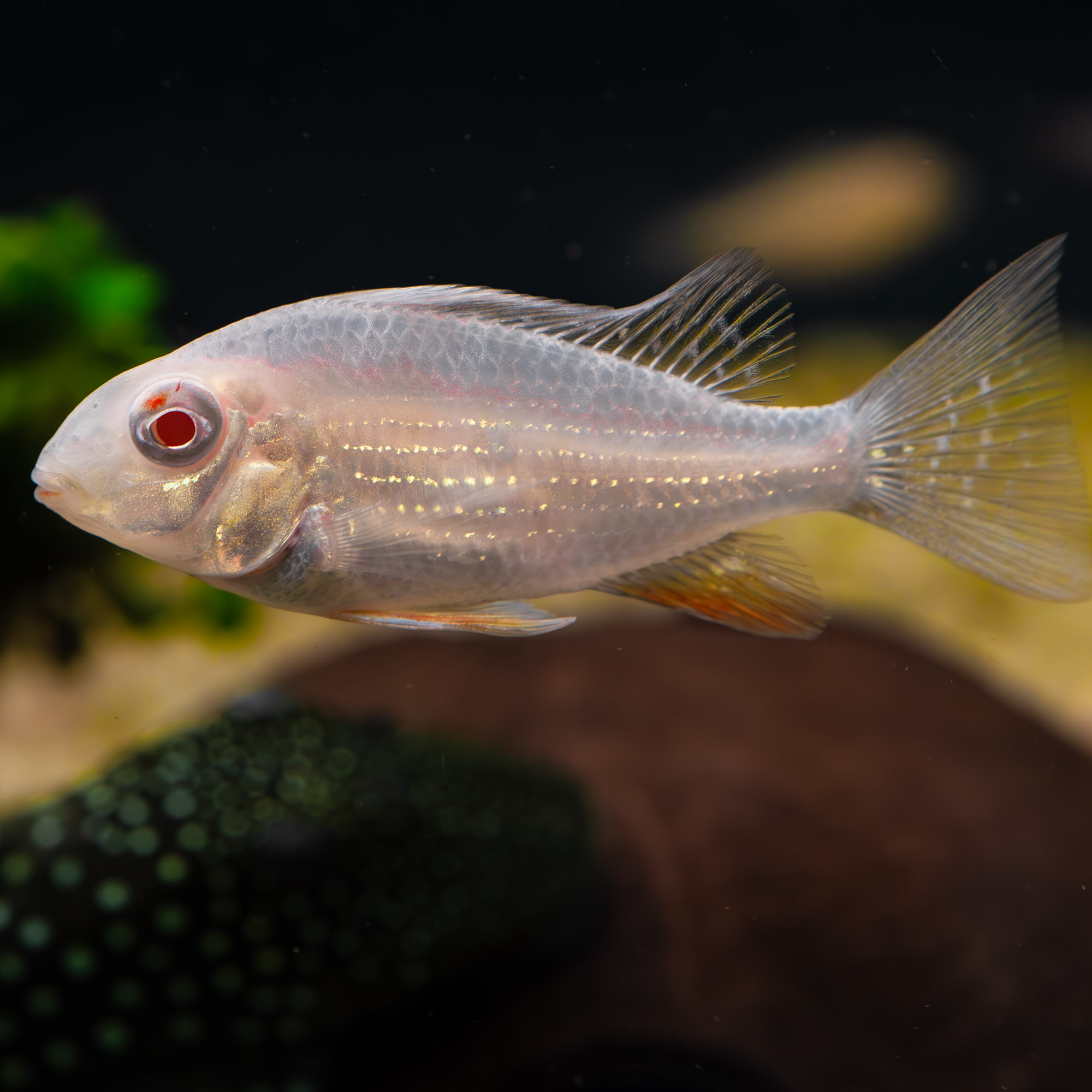 známá jako akara Heckelova albín, je středně velká cichlida původem z Jižní Ameriky. 🐠 Tato ryba si získala oblibu díky svému unikátnímu vzhledu – světlému, až narůžovělému tělu s výraznýma červenýma očima 👀, typickými pro albínní formy. Má elegantní, protáhlé tělo s nápadně prodlouženými ploutvemi a klidným vystupováním. Dorůstá délky až 20 cm a patří mezi klidnější cichlidy, i když v období tření může být mírně teritoriální. Vyžaduje prostornější akvárium s dostatkem úkrytů, pískovým dnem a dobrou filtrací.