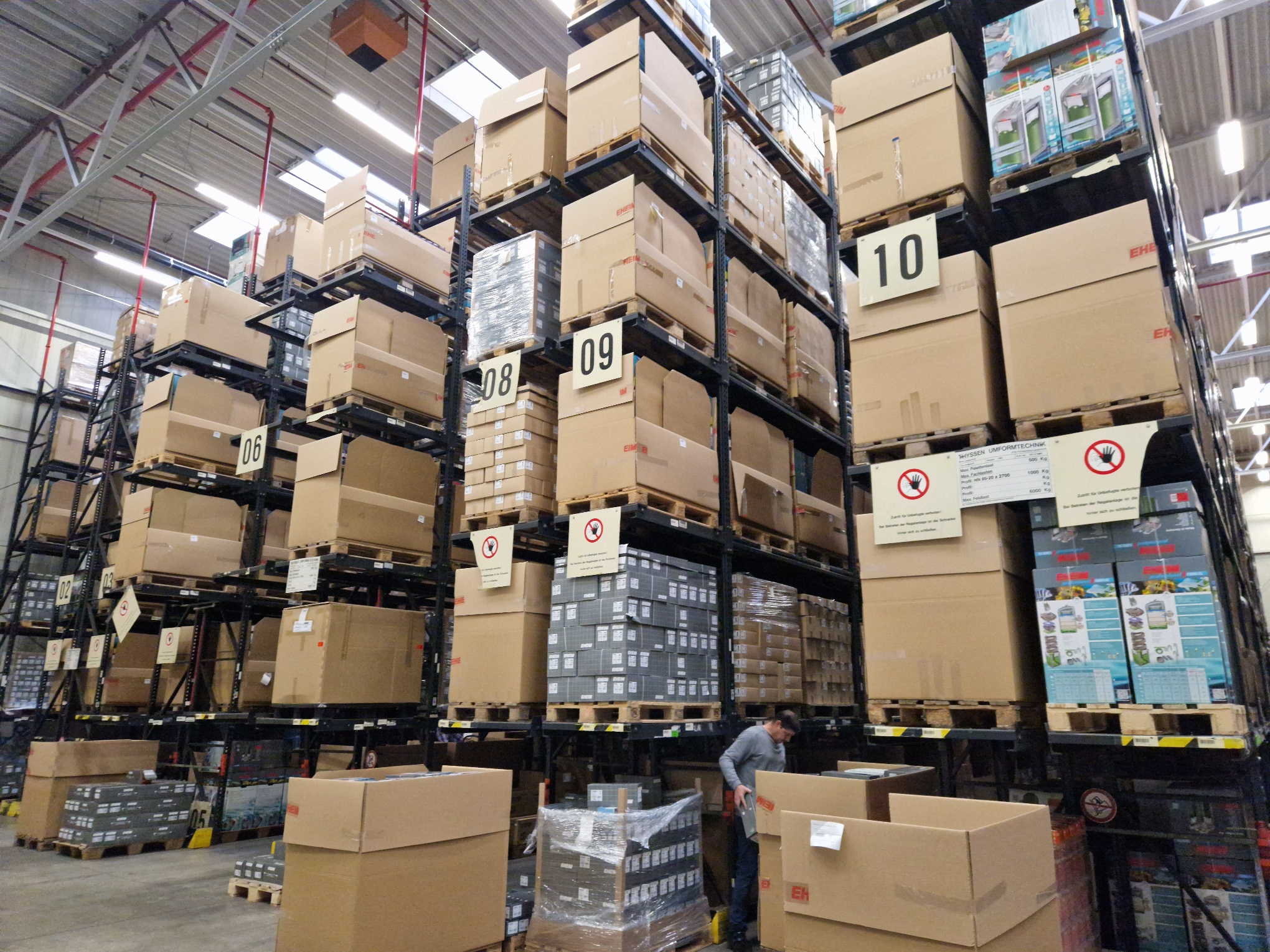 Maximálně automatizovaná továrna s obrovským skladem Většina výrobních procesů je plně automatizována nebo rozdělená na příslušné výrobní linky, kde se vždy zodpovědná osoba stará o zásobování strojů nebo kompletaci příslušných dílů. Aby společnost Eheim mohla zaručit maximální kvalitu svých produktů, tak výrobu všech plastových výlisků, rotorů a statorů k čerpadlům provádí přímo ve fabrice. Před prodejem jsou vždy produkty testovány a předány k expedici. Na fotografii můžete vidět jednu ze skladových hal, která je plně připravená na nadcházející akvaristickou sezónu. |