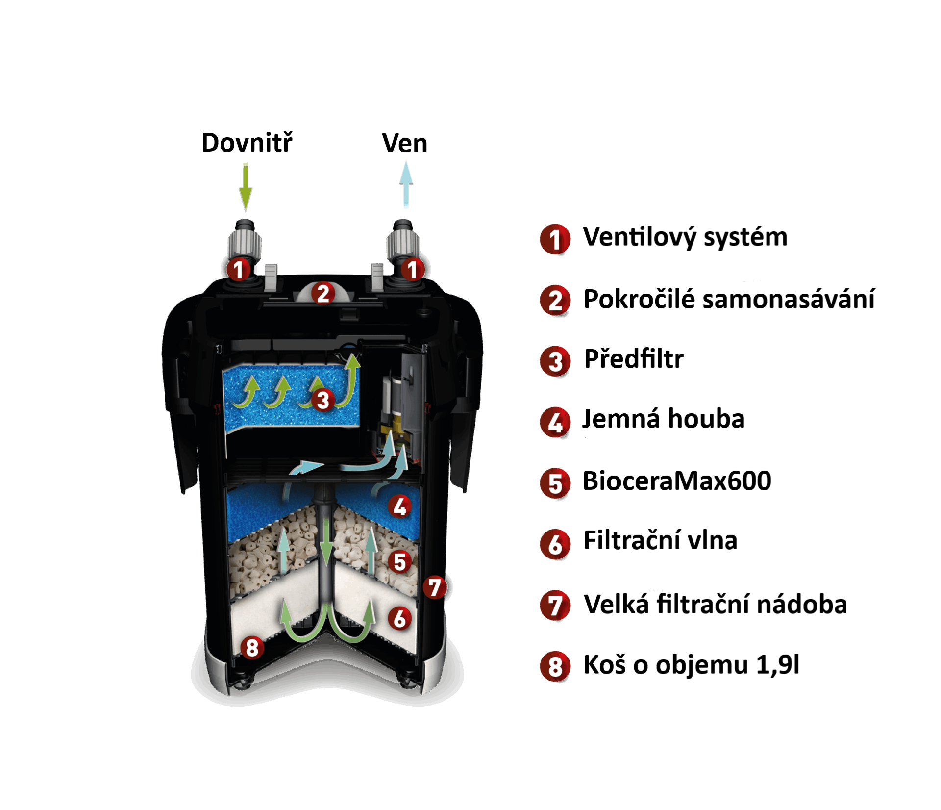 Bezprecedentní výkon Filtry ULTRAMAX se mohou pochlubit vysokým průtokem vody a mohou efektivně pracovat i ve velmi velkých nádržích. Kromě toho jsou velmi prostorné, takže pojmou velké množství filtračních médií. Filtrační média jsou umístěna v praktických ergonomických koších, z nichž každý má objem 1,9 l. To zaručuje mimořádně účinnou mechanickou a biologickou filtraci. Filtry jsou dodávány s kompletní sadou filtračních médií pečlivě vybraných tak, aby vyhovovaly potřebám typického akvária.