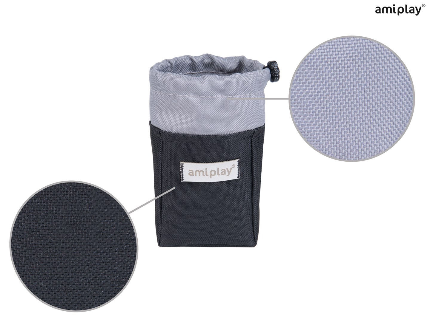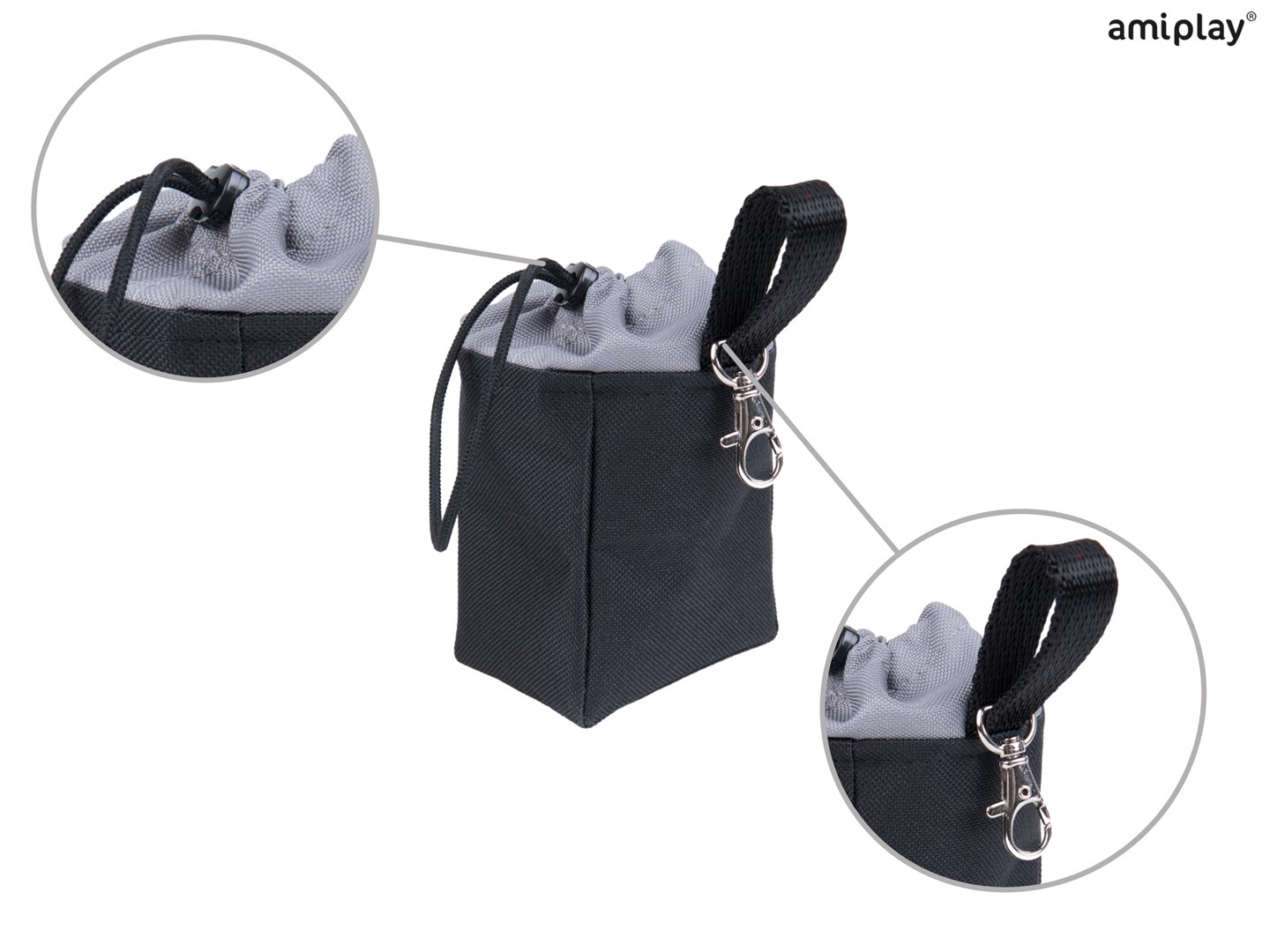 Taška má poutko s karabinou, takže ji můžete připevnit přímo ke kalhotám nebo provléknout opaskem. Chcete-li zabránit vysypání pamlsků nebo ochránit obsah před deštěm, jednoduše sáček uzavřete stahovací šňůrkou.