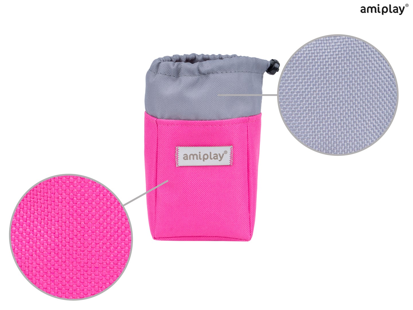 Taška má poutko s karabinou, takže ji můžete připevnit přímo ke kalhotám nebo provléknout opaskem. Chcete-li zabránit vysypání pamlsků nebo ochránit obsah před deštěm, jednoduše sáček uzavřete stahovací šňůrkou.