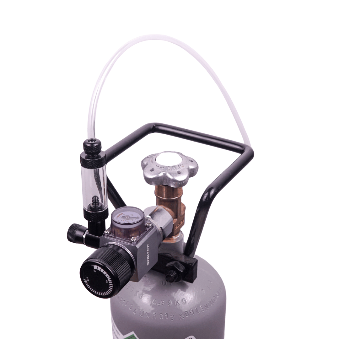 Kompletní CO2 set složený z lahve, regulátoru, hadičky a dropcheckeru.