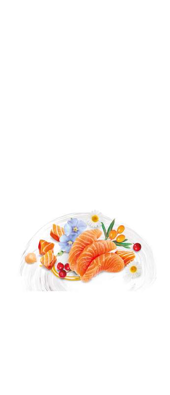 Dehydrovaný losos (30 %), čerstvý losos (26 %), drůbeží tuk (konzervovaný tokoferoly, 12 %), žlutý hrách (12 %), cizrna (7 %), lososový olej (3 %), hydrolyzovaná kuřecí játra (2 %), lněné semínko (2 %), sušená jablka (2 %), hrachová mouka, pivovarské kvasnice (1 %), kolostrum (0,5 %), sušený heřmánek (0,5 %), olej z mořských řas (0,3 %, Schizochytrium limacinum), sušený rakytník řešetlákový (0,3 %), sušené brusinky (0,2 %), frukto-oligosacharidy (0,025 %), mannan-oligosacharidy (0,02 %), juka schidigera (0,01 %), inaktivované bakterie a jejich části (Lactobacillus helveticus HA – 122, 15x109 buněk/kg).