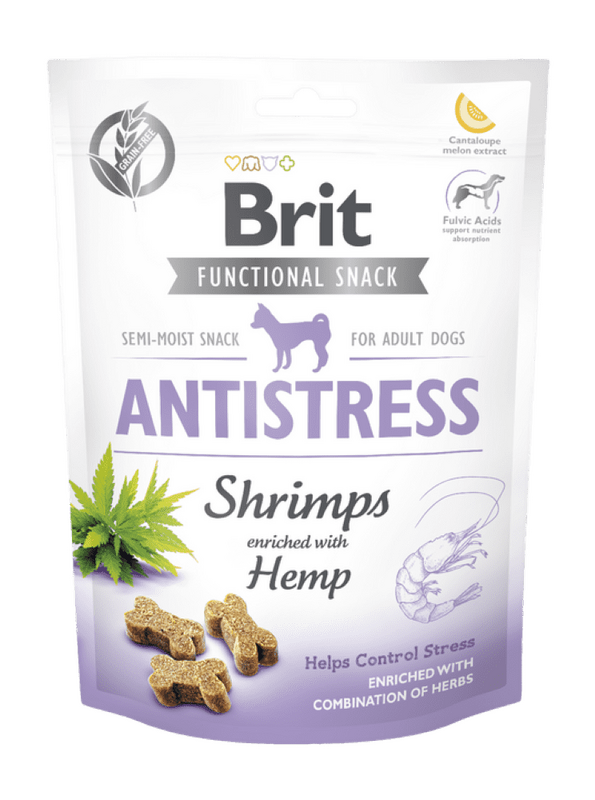 Brit Care Dog - Funkční pamlsek pro psy "Antistress" s krevetami a konopímReceptura s krevetami obohacená konopím pomáhá udržet stres pod kontrolou.