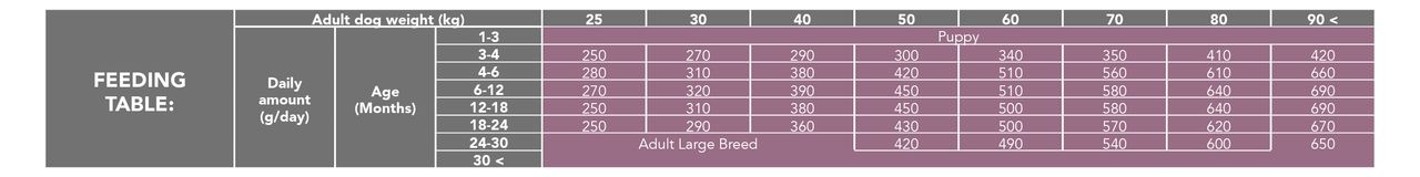 Doporučené krmení Denní dávka se může lišit v závislosti na aktivitě a věku vašeho psa. Zajistěte vašemu psovi vždy dostatek čerstvé pitné vody. Od 1 do 3 měsíců věku štěněte krmte řadou Puppy (štěně). Od 24 do 30 měsíců věku štěněte při váze dospělého psa do 50kg krmte řadou Adul Large Breed (dospělý pes velká plemena). Od 30 měsíců věku štěněte krmte řadou Adult Large Breed (dospělý pes velká plemena).