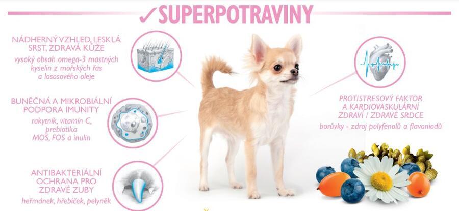 Superprémiové hypoalergenní krmivo zaměřené na specifické potřeby malých plemenKrmivo pro malé psy, jehož klíčovými benefity jsou stravitelnost a chutnost díky čerstvým proteinům. Hlavní je přístup prevence výživou, který v případě malých pejsků znamená soubor přírodních aditiv pro podporu imunity. Je rovněž zajištěn nízký glykemický index krmiva, prevence obezity, nižší zátěž trávicího traktu a stabilizace hladiny krevního cukru.