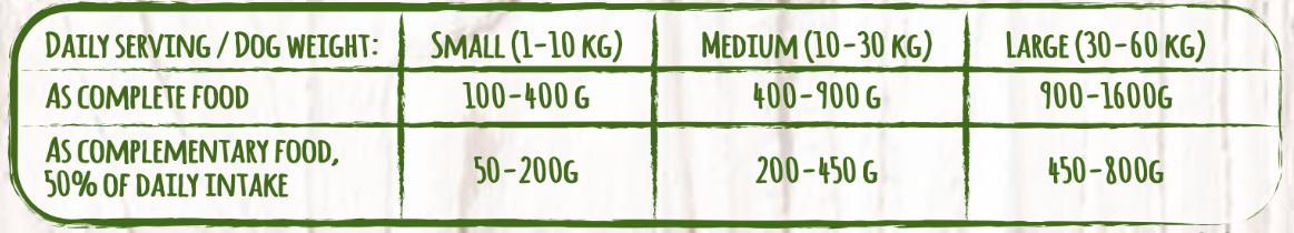| Denní dávka jako kompletní krmivo | 100 - 400 g | 400 - 900 g | 900 - 1600 g |