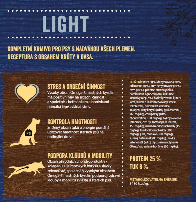 Vhodné pro dospělé psy všech plemen pro psy se sklonem k přibírání na vázePrémiové kompletní krmivo, které respektuje různorodost plemen s vysokým podílem masa z vykostěné a sušené krůty, zajistí vyšší chutnost a lepší stravitelnost. Oves, starobylá obilovina bez lepku, je bohatý zdroj energie, nezpůsobuje alergie a zajišťuje skvělou snášenlivost krmiva. Receptura je obohacena o lososový olej, ovoce a bylinky.