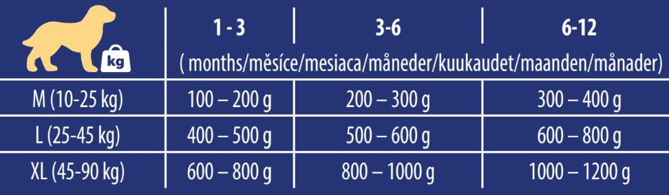 Váha psa (kg) | 1 - 3 měsíců | 3 - 6 měsíců | 6 - 12 měsíců |