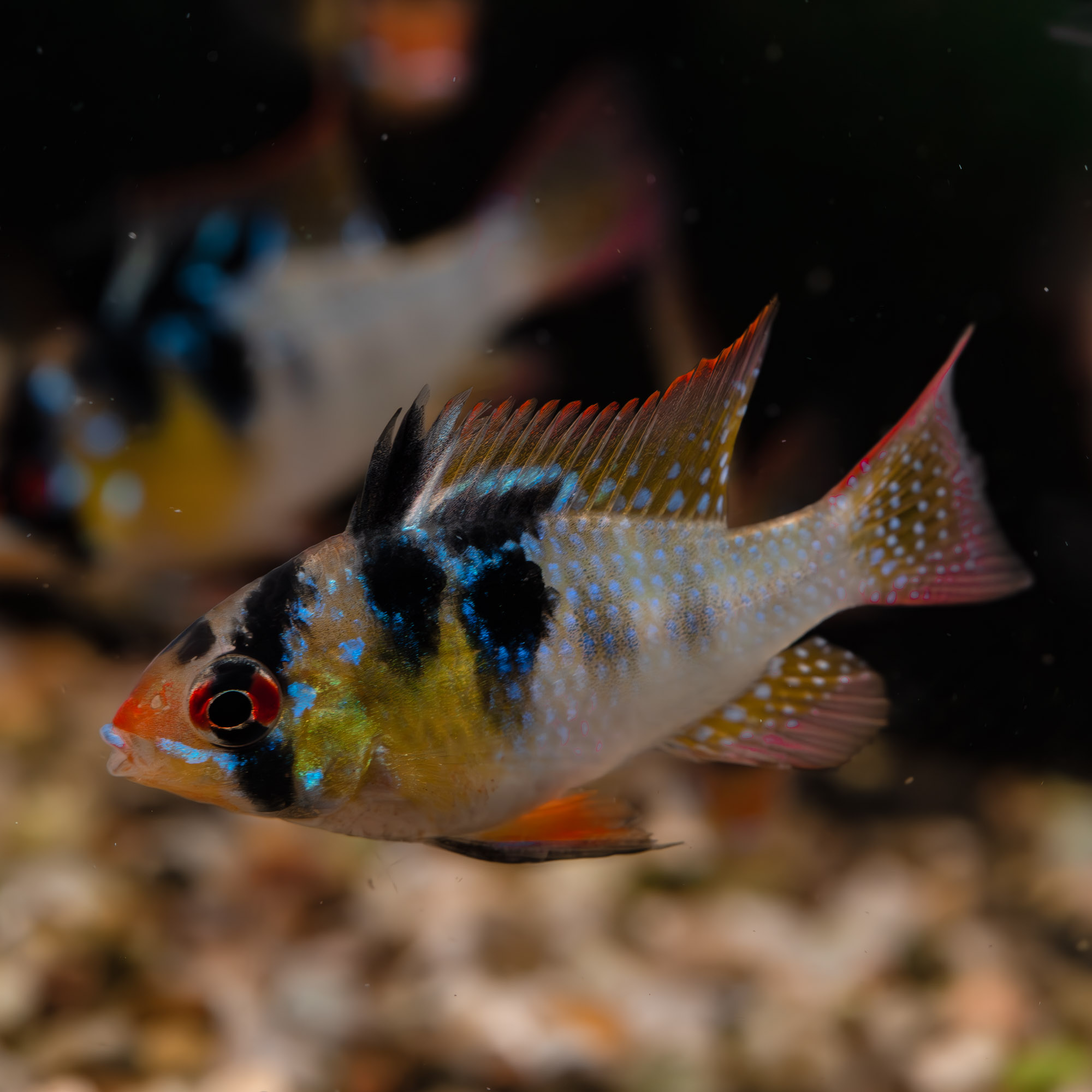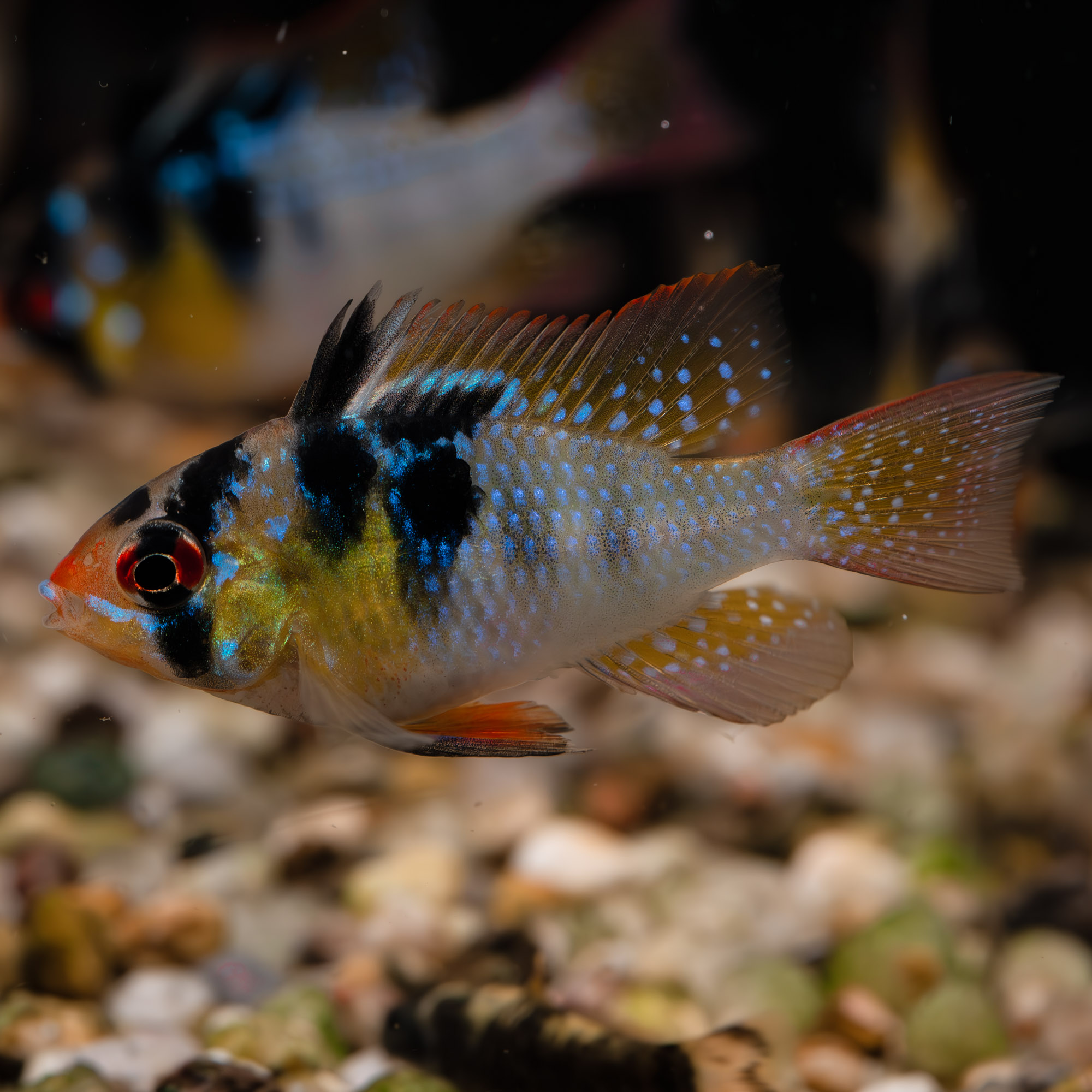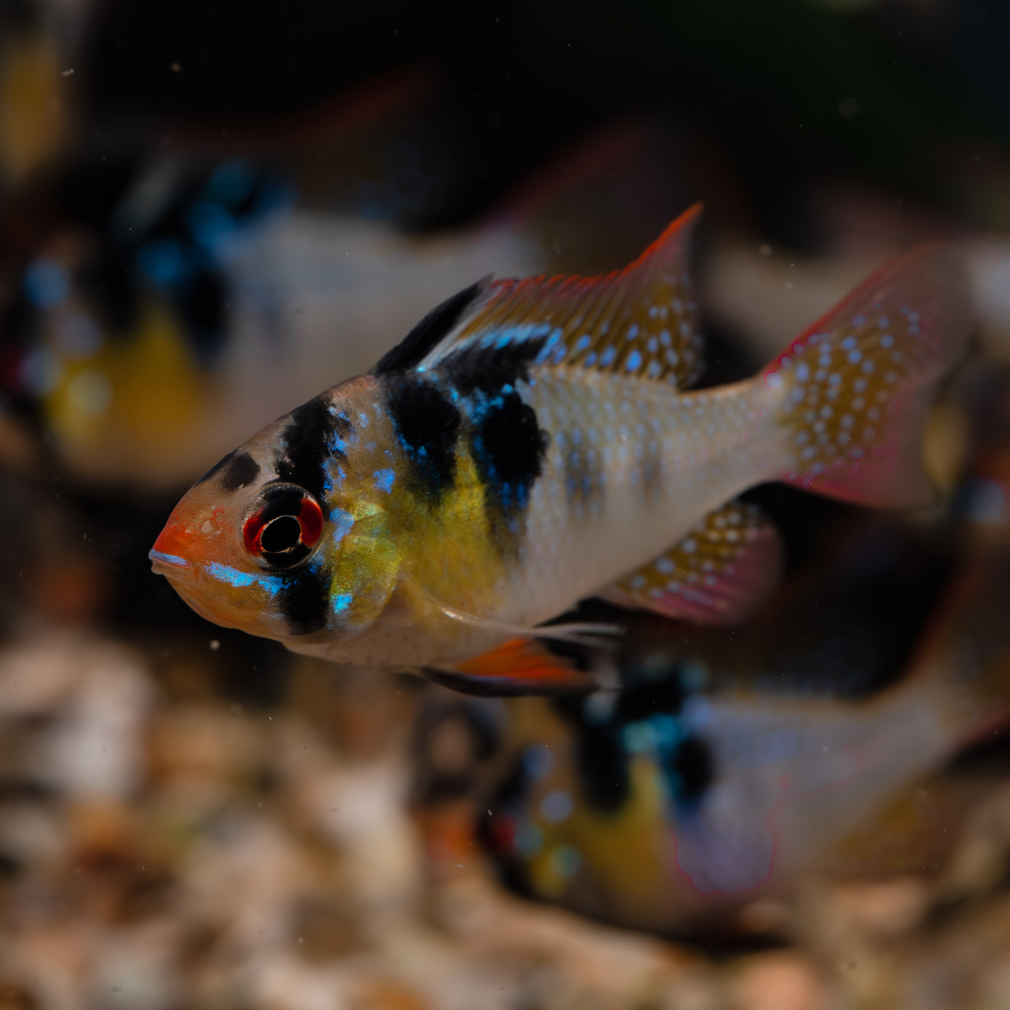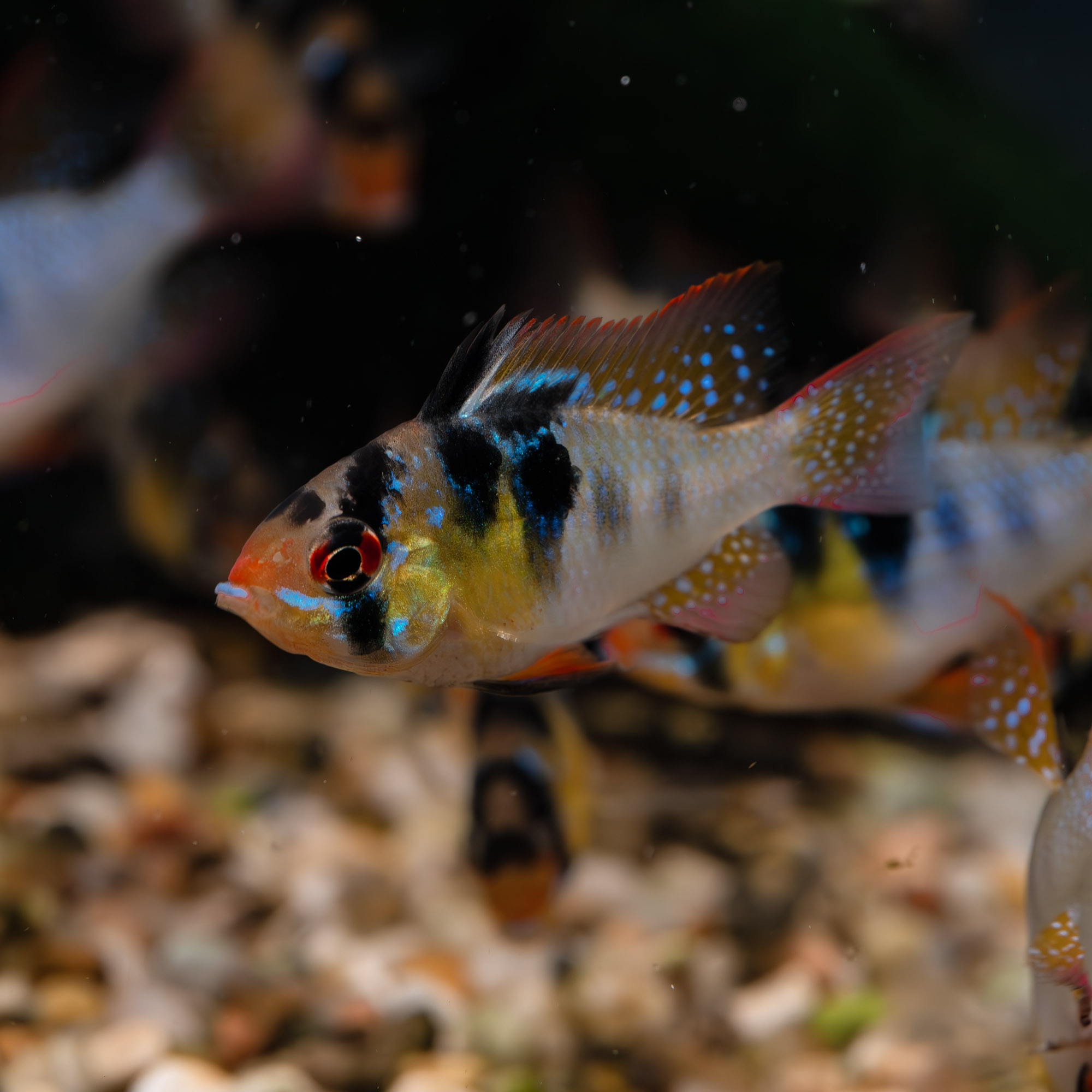 známá také jako motýlí cichlidka 🦋, je drobná, mírumilovná a velmi oblíbená akvarijní ryba původem z povodí řeky Orinoko v Jižní Americe. 🐠 Díky svému nádhernému zbarvení, kompaktnímu tělu a zajímavému sociálnímu chování je často chována v společenských akváriích. Samečci jsou větší a pestřeji zbarvení než samičky – u vyšlechtěných forem se objevují zářivě modré, zlaté, žluté nebo dokonce neonově zářící tóny. Ryby dorůstají do velikosti přibližně 5–7 cm. Jsou velmi klidné a vhodné i pro začátečníky, ale citlivé na kvalitu vody.