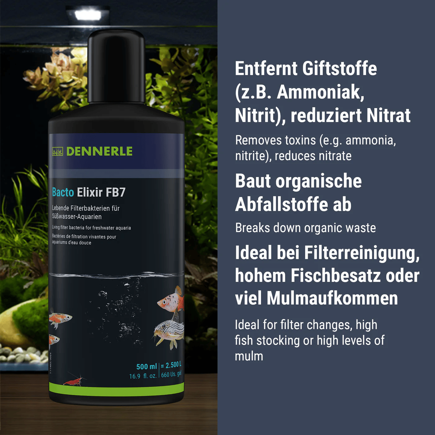 Bacto Elixier FB7 obsahuje více než 15 milionů aktivních bakterií na mililitr – a to hned při plnění do lahve. Po aplikaci se bakterie okamžitě aktivují a pomáhají odstraňovat nečistoty z vody, dna i filtrace. Výrazně zlepšují kvalitu vody, omezují tvorbu kalu a usnadňují údržbu nádrže.