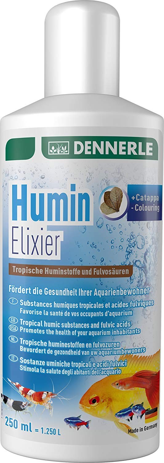 Humin Elixir je přírodní přípravek s vysokým obsahem huminových a fulvových kyselin pro akvária s rybami a bezobratlými z tropických černých vod. Pomáhá vytvářet biotopově přirozené prostředí, zklidňuje ryby, potlačuje škodlivé mikroorganismy a podporuje úspěšné chování i rozmnožování náročnějších druhů.