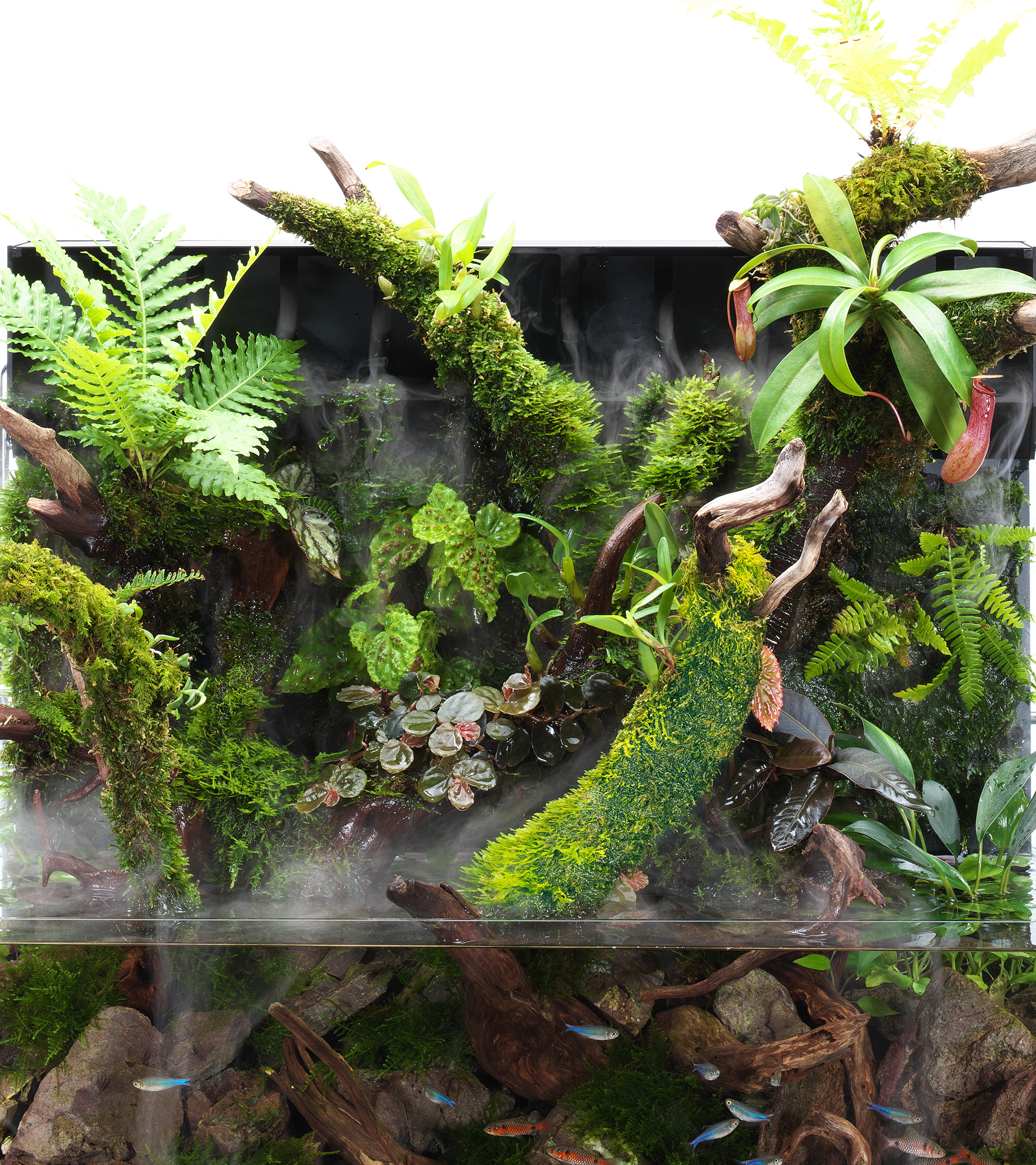 Mizukusa Wall 60 od DOOA je nástupcem populární zdi Wabi-Kusa. Černá stěna je vybavena houbami, ke kterým lze připojit rostliny, jako jsou mechy, kapradiny a orchideje, což usnadňuje přeměnu akvária na paludárium. Zeď je napájena čerpadlem, díky kterému voda pomalu stéká po rostlinách a zabraňuje tak jejich vysychání. Mizukusa Wall 60 přináší džungli do vašeho obývacího pokoje.Proč si pořídit Mizukusa Mist Wall