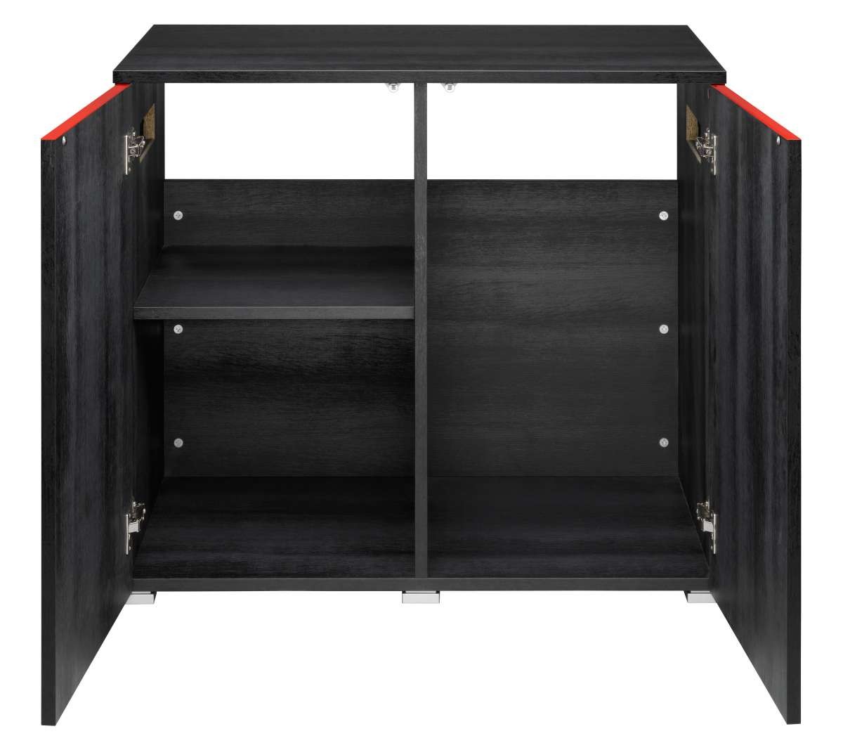 Výrazná spodní skříňka v černé barvě má bezúchytková dvířka a na boku další obložené otvory pro kabely a hadice. Obzvláště elegantní design vám nabízí dvě tváře: Sami se rozhodnete, zda chcete použít červenou melírovací hranu dvířek skříněk jako výrazný prvek, nebo zvolíte jednoduchou variantu. Otočením dvířek můžete zvýraznění umístit buď stručně nahoru, nebo nenápadně dolů. Vašemu individuálnímu vkusu nic nebrání.