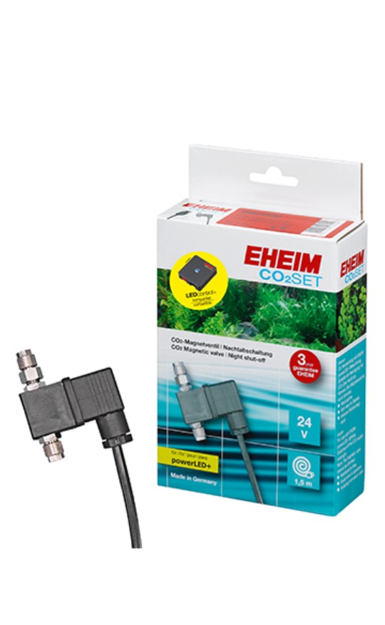 Tento magnetický ventil byl speciálně vyvinut pro systém ovládání osvětlení EHEIM LEDcontrol+. Připojuje se k osvětlení EHEIM powerLED+ a LEDcontrol+ a vypíná dodávku CO2 během fáze západu slunce a přes noc. Za svítání je dodávka CO2 znovu aktivována. Magnetický ventil lze ovládat i bez LEDcontrol+ se standardním časovačem. Pozor: Magnetický ventil nelze stmívat.