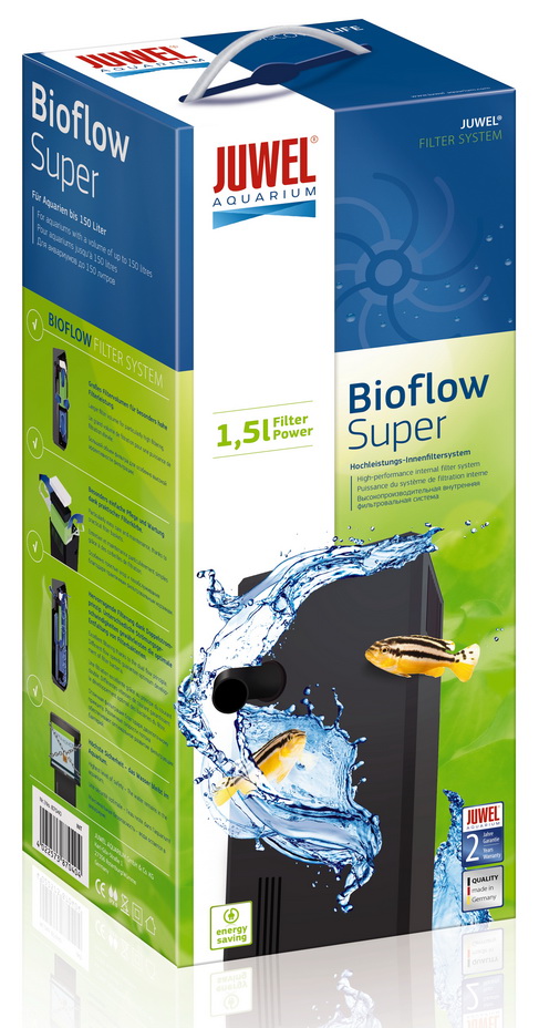 Juwel Bioflow Filter System obsahuje dvoufázový biologický vnitřní filtrační systém, včetně čerpadla a filtračních materiálů. Filtrační systém lze jednoduše instalovat pomocí akvarijního silikonu.
