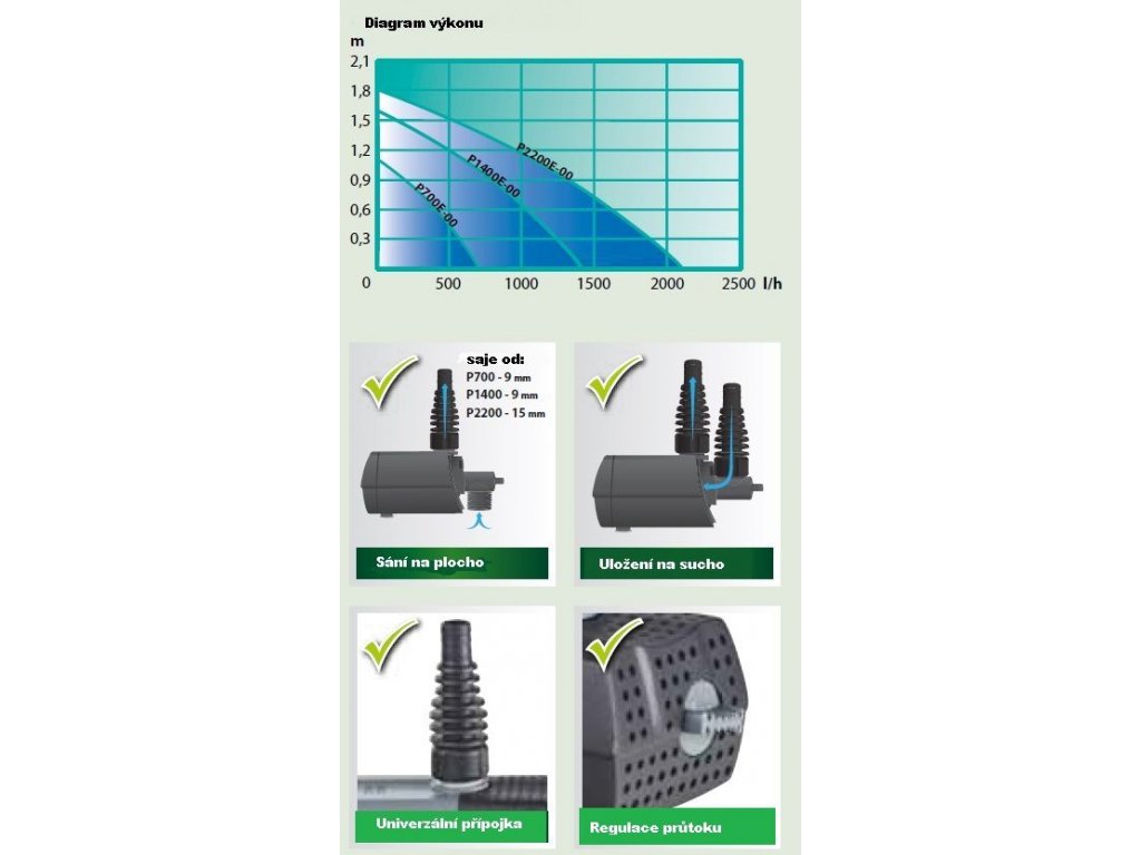 Má velice nízkou spotřebu elektrické energie a vysoký stupeň účinnosti. Při vývoji byl kladen důraz na tichý chod, funkčnost a snadné čištění. Čerpadla jsou určená pro napájení fontán, chrličů, terasových jezírek. Čerpadlo lze umístit jak ve vodě, tak díky dvěma hadicovým přípojkám i mimo vodu. Při napájení fontán a chrličů oceníte možnost regulace průtoku vody. Díky kompaktním rozměrům snadno umístíte i v malém prostoru, snadná údržba. Čerpadlo je vybaveno ECO synchronním motorem, možnost sání na plocho.