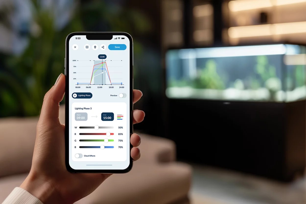 Ovládejte osvětlení akvária pomocí hlasových příkazů pomocí Alexa, Siri a Google. Jednoduše zadejte požadovanou světelnou náladu a systém automaticky upraví osvětlení.