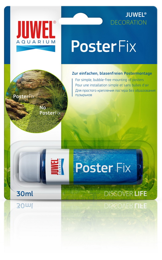 JUWEL PosterFix je speciální olej určený pro upevnění akvarijních tapet na zadní stěnu akvária. Zabraňuje nevzhlednému lomu světla, čímž zvýrazňuje barvy i detaily motivu a dodává pozadí atraktivní trojrozměrný efekt. Tapetu lze kdykoliv snadno odstranit.