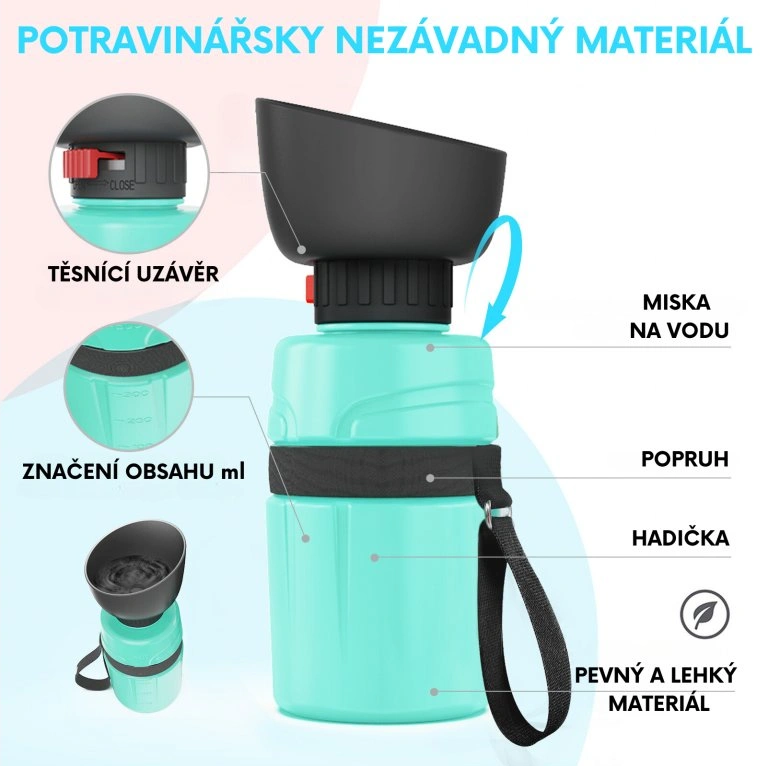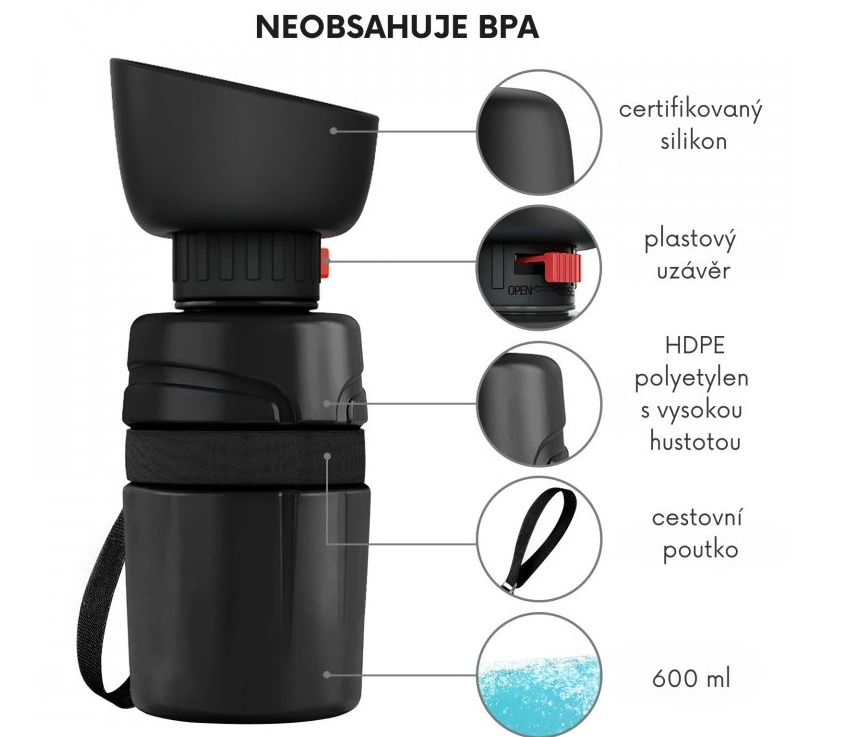 Lahev je navíc vybavena praktickým poutkem kolem obvodu, což znamená, že ji můžete snadno připnout na batoh, vodítko, nebo pásek. Pohodlně si ji vezmete kamkoliv a váš čtyřnohý chlupáč bude mít vždy dostatek pití.