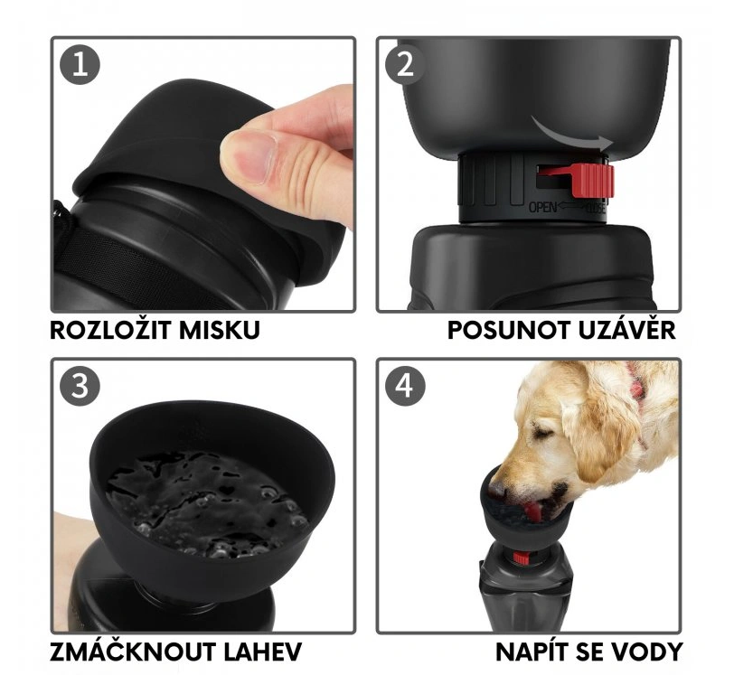 Na vrchním uzávěru láhve najdete ohrnovací misku. Stačí jen odjistit uzávěr, lehce stisknout lahev a voda se okamžitě přepustí do misky. Uzávěr zavřete a dáte chlupáči napít. A to nejlepší je, že po občerstvení znovu odjistíte uzávěr a zbylá voda se vrátí zpět do lahve. Vyhnete se tak plýtvání vodou.
