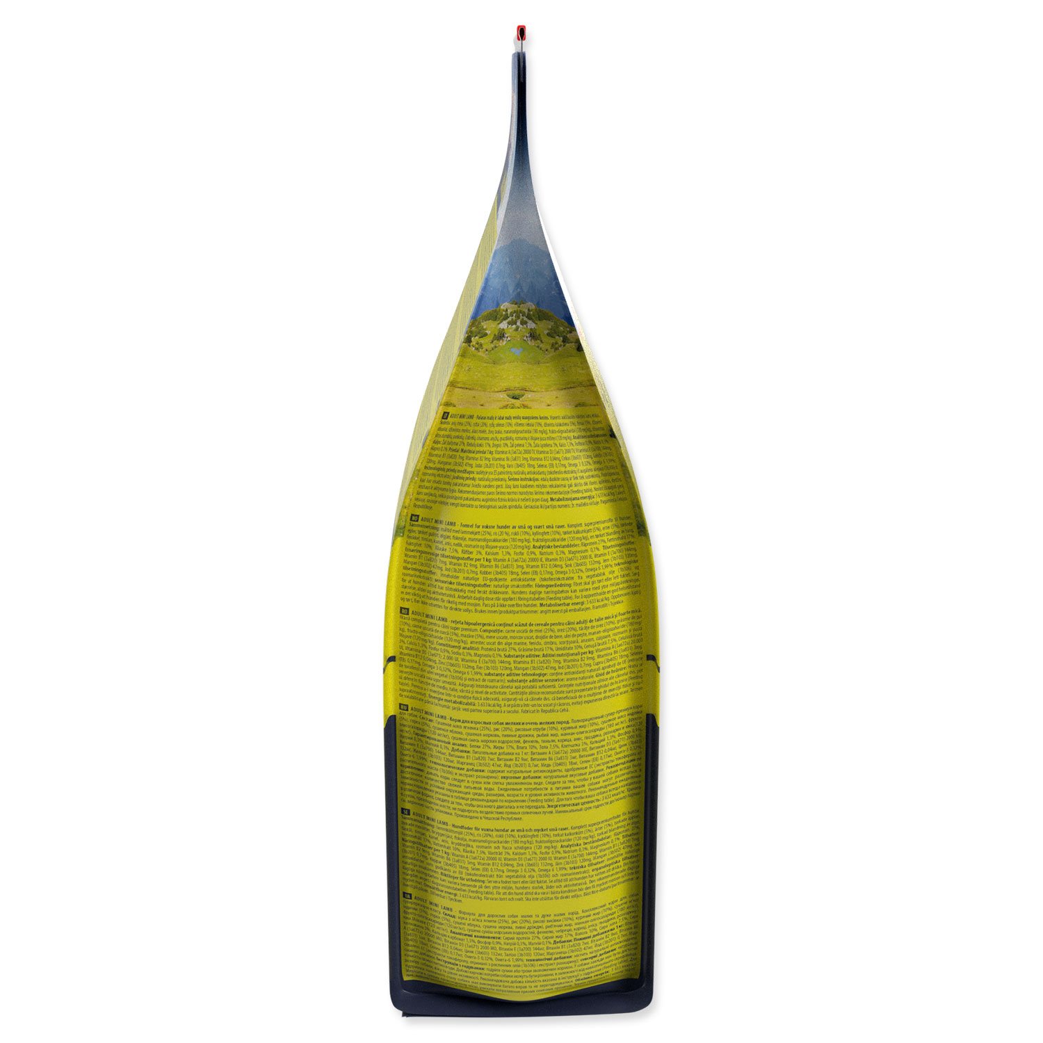 Sušené jehněčí (25%), rýže (20%), rýžové otruby (10%), kuřecí tuk (10%), sušené krůtí (5%), hrách (5%), sušená jablka, sušená mrkev, pivovarské kvasnice, rybí olej, mananoligosacharidy (180 mg/kg), fruktooligosacharidy (120 mg/kg), sušená směs mořských řas, fenyklu, tymiánu, skořice, anýzu, hřebíčku, rozmarýnu a juky Mojave (120 mg/kg).