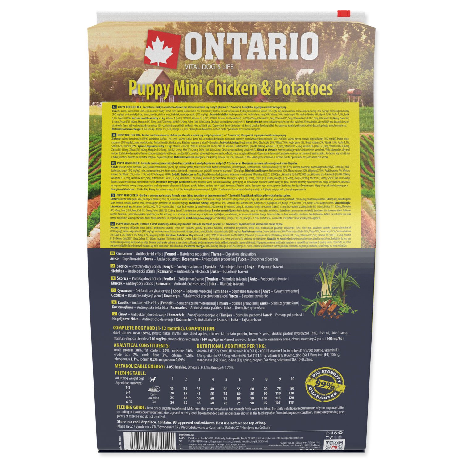 Krmivo pro štěňata musí splňovat vysoké výživové a nutriční požadavky pro jejich správný vývoj a růst. Proto značka Ontario vyvinula ve spolupráci s veterináři a nutričními specialisty unikátní a výjimečně chutnou recepturu, která poskytuje vyvážené složení, správný poměr všech živin a dostatek energie pro kvalitní start Vašeho štěněte do života. Kvalitní strava je jednou z nejdůležitějších podmínek pro zdravý a dlouhý život Vašeho psa. Receptura krmiva je založená na vysokém podílu proteinů z kuřecího masa důležitých pro správný vývoj svalů a tkání a na bramborách, které jsou po tepelné úpravě nejlepším zdrojem sacharidu. S nízkým obsahem obilovin, bez pšenice a kukuřice. Jedinou obilovinou je rýže. Vyvážené složení pro zdravé fungování a vývoj celého organismu. Speciální mix bylinek a koření, zejména rozmarýn a skořice, pro podporu přirozené imunity a poskytující antibakteriální efekt. Krmivo obsahuje širokou škálu vitamínů a minerálů podporující zdravý růst a vývin.Hlavní přednosti