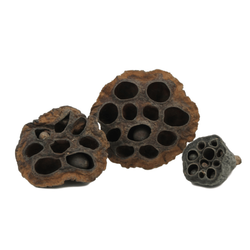 Lotosové lusky (Nelumbo nucifera) jsou krásnou přírodní dekorací, která nejen dodá akváriu autentický vzhled, ale má i benefiční účinky na vodu a obyvatele nádrže. Díky malým otvorům poskytují krevetám a rybám úkryt i místo k hledání potravy. Lusky obsahují třísloviny, které mírně snižují pH vody, působí antibakteriálně, redukují stres a dodávají vodě přírodní hnědý odstín – ideální pro blackwater akvária.