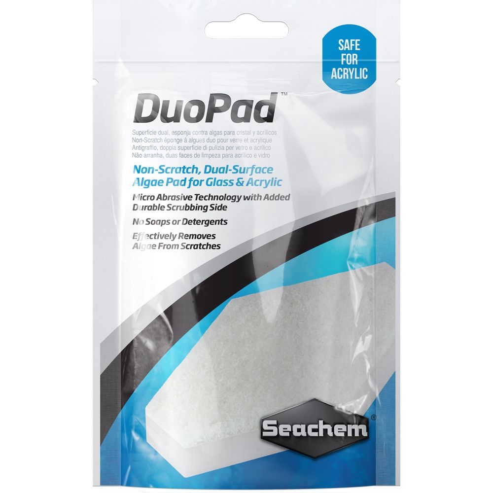 Efektivní čištění skla i dekorací bez chemie a škrábanců. Seachem DuoPad je speciálně navržená houbička s dvěma povrchy – jemnou melaminovou stranou pro odstraňování řasy ze skla a hrubší stranou pro očištění kamenů či kořenů. Neobsahuje žádné detergenty ani toxické látky a je 100% bezpečná pro obyvatele akvária.