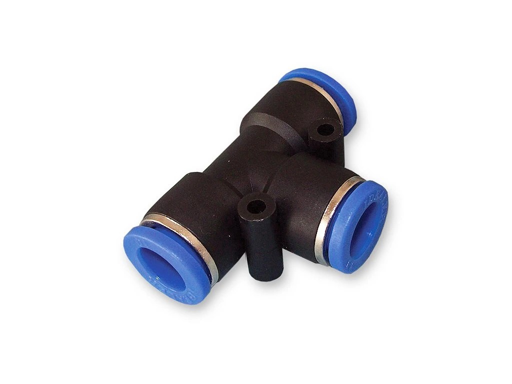 Univerzální nástrčná spojka ve tvaru T, která je ideální pro rozdělení tlakových rozvodů z polyamidových trubek. Díky nástrčnému systému připojení je montáž rychlá, jednoduchá a bez nutnosti použití nářadí. Skvěle se hodí pro rozvody vzduchu, vody nebo CO2 systémy v akváriích a teráriích.