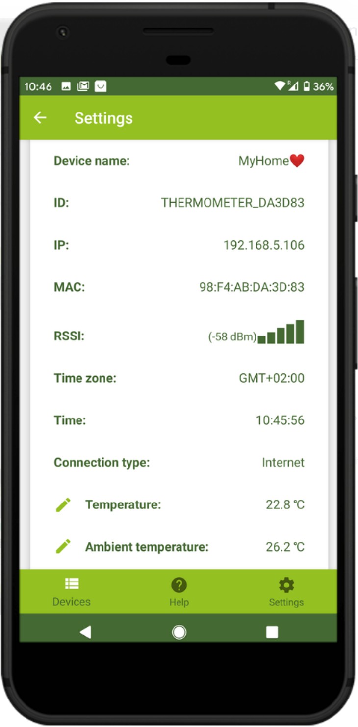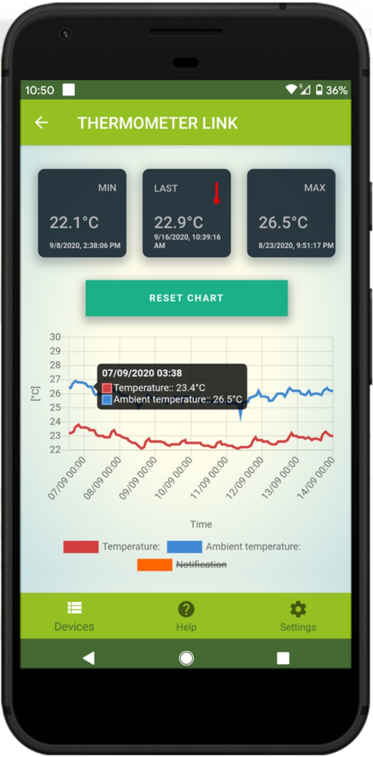 | Mobilní aplikace Umožňuje nastavit požadovaný teplotní rozsah. Pokud je teplota mimo nastavený rozsah, aplikace odešle alarmové oznámení. Zařízení zaznamenává a ukládá údaje o teplotě uvnitř i vně nádrže. | ![]() |