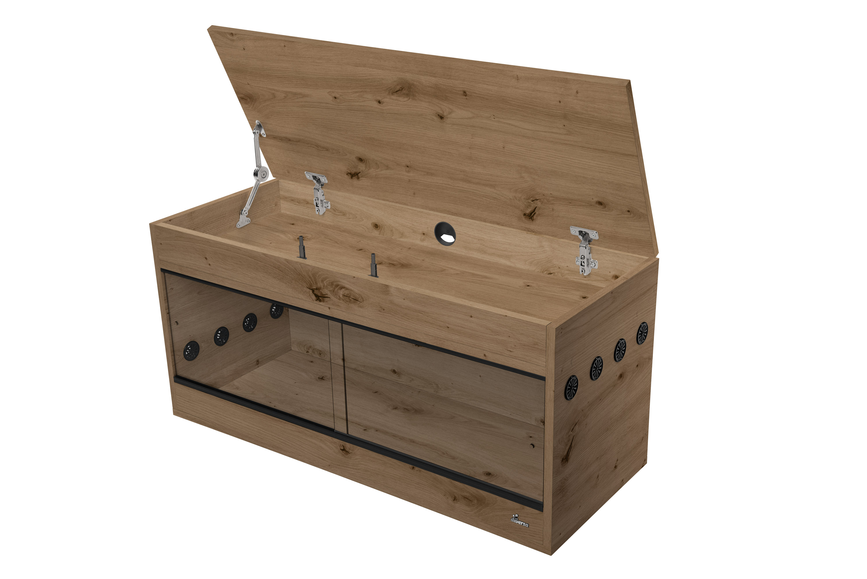 Moderní terárium s praktickým nástavcem, který slouží jako dvojitý strop pro skrytou instalaci osvětlení i jako úložný prostor pro příslušenství. Skvělá volba pro chov hadů, gekonů, agamy, ježků a dalších zvířat milujících sušší prostředí. Kvalitní provedení zajišťuje stabilitu, výbornou tepelnou izolaci a dlouhou životnost.