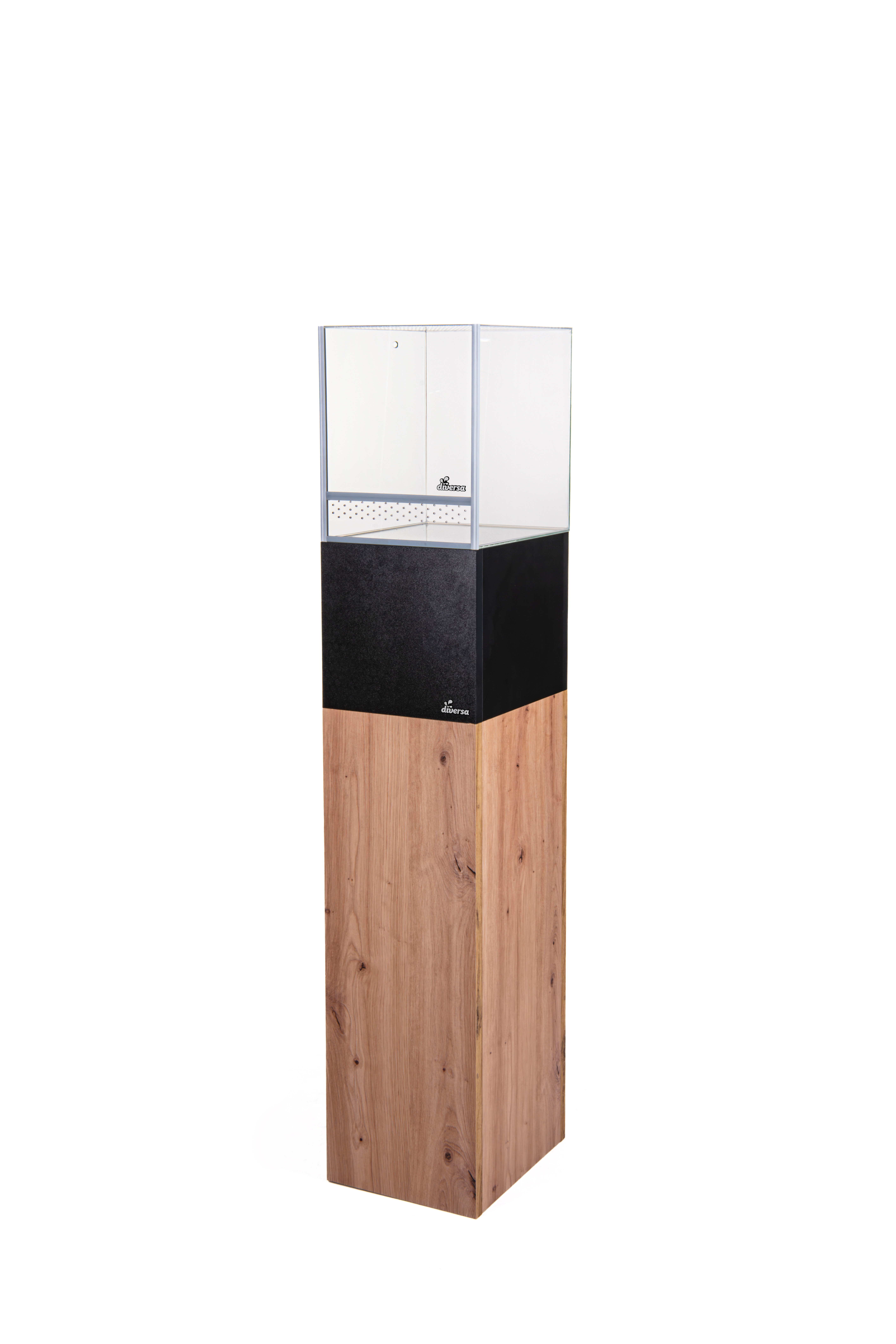 Minimalistický a pevný podstavec ideální pro menší terária s bezobratlými živočichy. Skříňka je navržena přesně podle rozměrů terárií pro kudlanky a pavouky. Kombinuje jednoduchou formu s elegantním kontrastem barev, díky čemuž ladí jak s moderními, tak i klasickými interiéry.