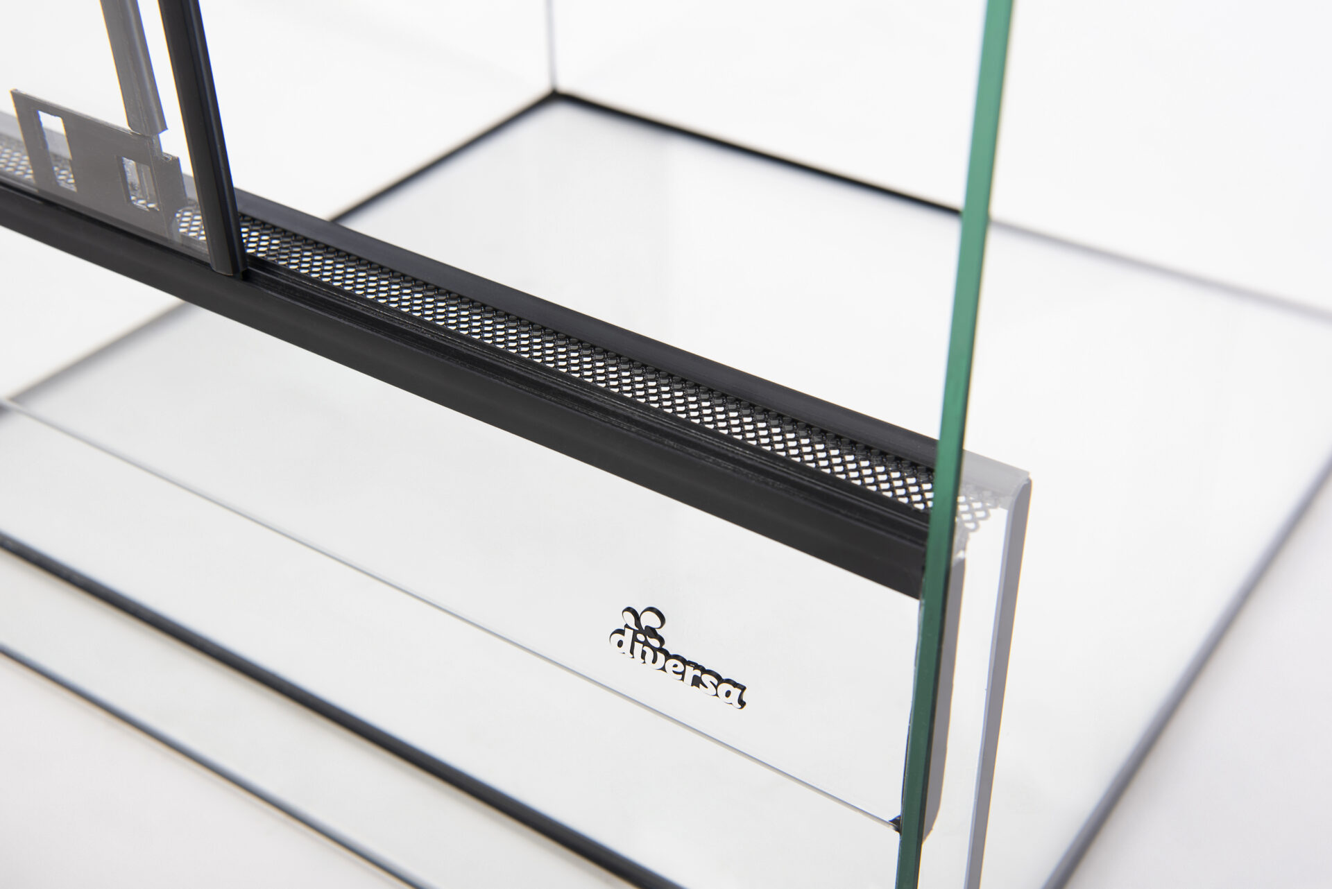 Toto vysoké skleněné terárium s praktickými posuvnými dveřmi, integrovaným zámkem a důmyslným systémem dvojité ventilace je navrženo speciálně pro druhy, které preferují prostor do výšky. Vrchní část tvoří perforovaný hliníkový rám s černou kovovou mřížkou, která umožňuje maximální odvětrání bez kompromisů na bezpečnosti. Díky černým detailům a silikonu působí terárium moderně a esteticky nenápadně – ideální volba pro náročné chovatele stromových žab, gekonů, anolisů nebo menších chameleonů.