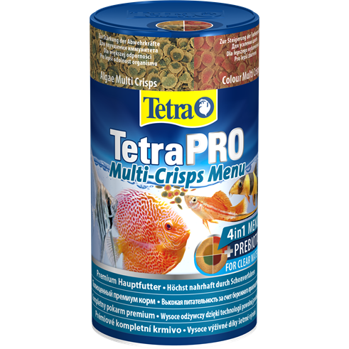 TetraPRO nastavuje nový standard ve výživě ryb. Prémiové kompletní krmivo se vyrábí šetrným postupem za nízkých teplot. Tento speciální výrobní postup dodává lupínkům TetraPRO Menu Multi-Crisps velmi vysokou nutriční hodnotu. Lupínky Multi-Crisps také absorbují méně vody než běžné vločkové krmivo. To zvyšuje obsah živin na objem. Všechna krmiva TetraPRO nabízejí také optimalizovaný poměr bílkovin a tuků. Ryby tak tuk využívají pro pohyb a bílkoviny cíleně pro tvorbu svalové hmoty. Menu TetraPRO v sobě spojuje všechny výhody různých lupínků Multi-Crisps. Koncentrát doplňující energii v lupíncích Energy Multi-Crisps zlepšuje vitalitu, zatímco lupínky Colour Multi-Crisps přinášejí přirozené zbarvení ryb. Lupínky Algae Multi-Crisps podporují odolnost a lupínky Growth Multi-Crisps růst. Inovativní dvoubarevná technologie vizualizuje přidané výhody různých lupínků Multi-Crisps. Rozpadají se také výrazně méně než běžné vločky, což značně snižuje množství prachu z krmiva v nádržích. Kvalitní prebiotika cíleně stimulují růst a metabolismus bakterií podporujících zdraví v zažívacím traktu tím, že působí jako upřednostňovaný zdroj potravy pro užitečné bakterie. To minimalizuje znečištění vody.