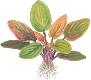 Tato rostlina je původem z Indie a je velmi podobná středně velkému, širokolistému kryptocorynu. Může být použit v akváriu jako Cryptocorynes, ale potřebuje dostatek světla pro vývoj barev. Listy jsou 4 - 8 cm široké a 6 - 12 cm dlouhé, takže celá rostlina se stává poměrně širokou. Barvy se pohybují od prašné zelené s jasně fialovou až po červenofialovou, často na stejném listu. Nové listy jsou světle růžové.Informace o rostlině