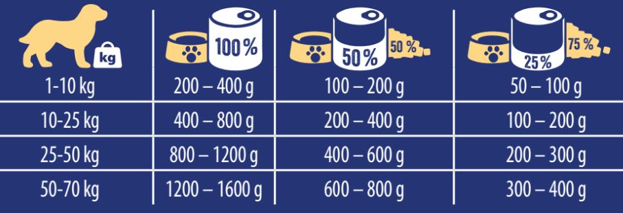 Denní nutriční požadavky vašeho psa se mohou lišit v závislosti na jeho prostředí, velikosti, věku a aktivitě. Konzervu podávejte při pokojové teplotě. Pokud podáváte pro zvýšení rozmanitosti a chuti, přiměřeně snižte doporučenou denní dávku pravidelné stravy vašeho psa. Vždy zajistěte čerstvou pitnou vodu.