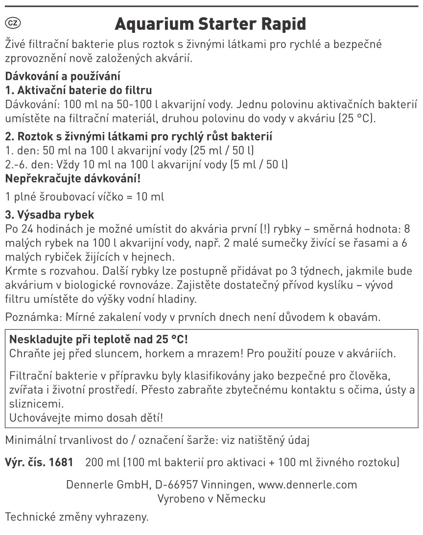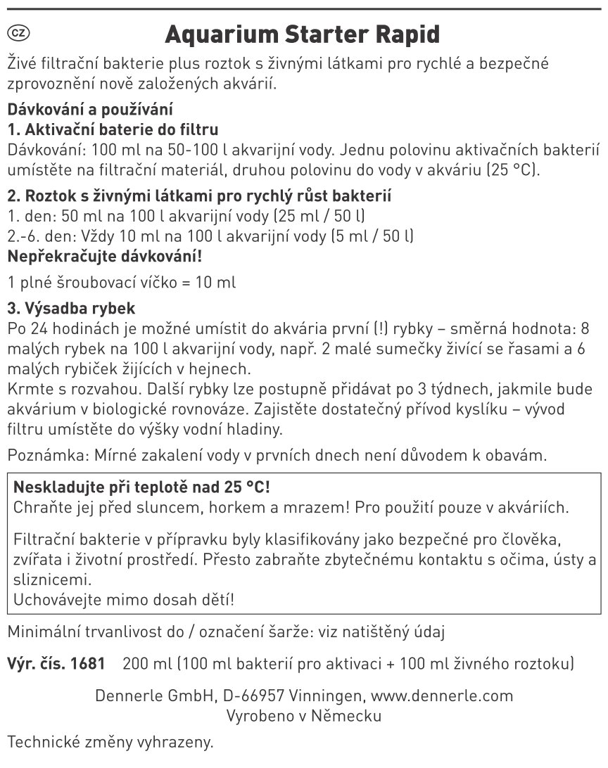 Dennerle Aquarium Starter Rapid je dvojbalení živých bakterií a výživného roztoku pro okamžité osídlení filtru a substrátu prospěšnými mikroorganismy. Zajistí biologickou rovnováhu už za 24 hodin – ideální pro nové nádrže.