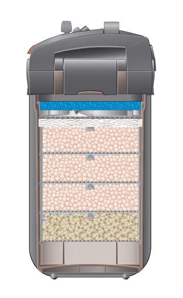 | Programy filtru Konstatní proud = filtr neustále udržuje stejný průtok i přes znečištění filtračních materiálů. Bio režim = filtr udržuje dva různé průtoky během dne např. silnější přes den a slabší v noci. Pulzní režim = Filtr střídá maximální a minimální průtok, tak aby vytvářel vlny na hladině akvária, vhodné např pro tlamovce. Manuální režim = Filtr proudí podle nastavenýho průtoku Další funkce: Automatické odvzdušnění, střídavým vypínáním a zapínáním. Indikace znečištění filtrace | |
