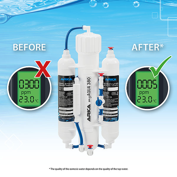 | Technické parametry: Denní výkon max. 380 l Osmická voda/zbytková voda Výdatnost cca. 1:3–4 Kapacita zadržování soli 98 % – 99 % Membrána: 100 GPD Rozměry: Výška: 350 mm Šířka: 190 mm Hloubka: 100 mm | ![]() |