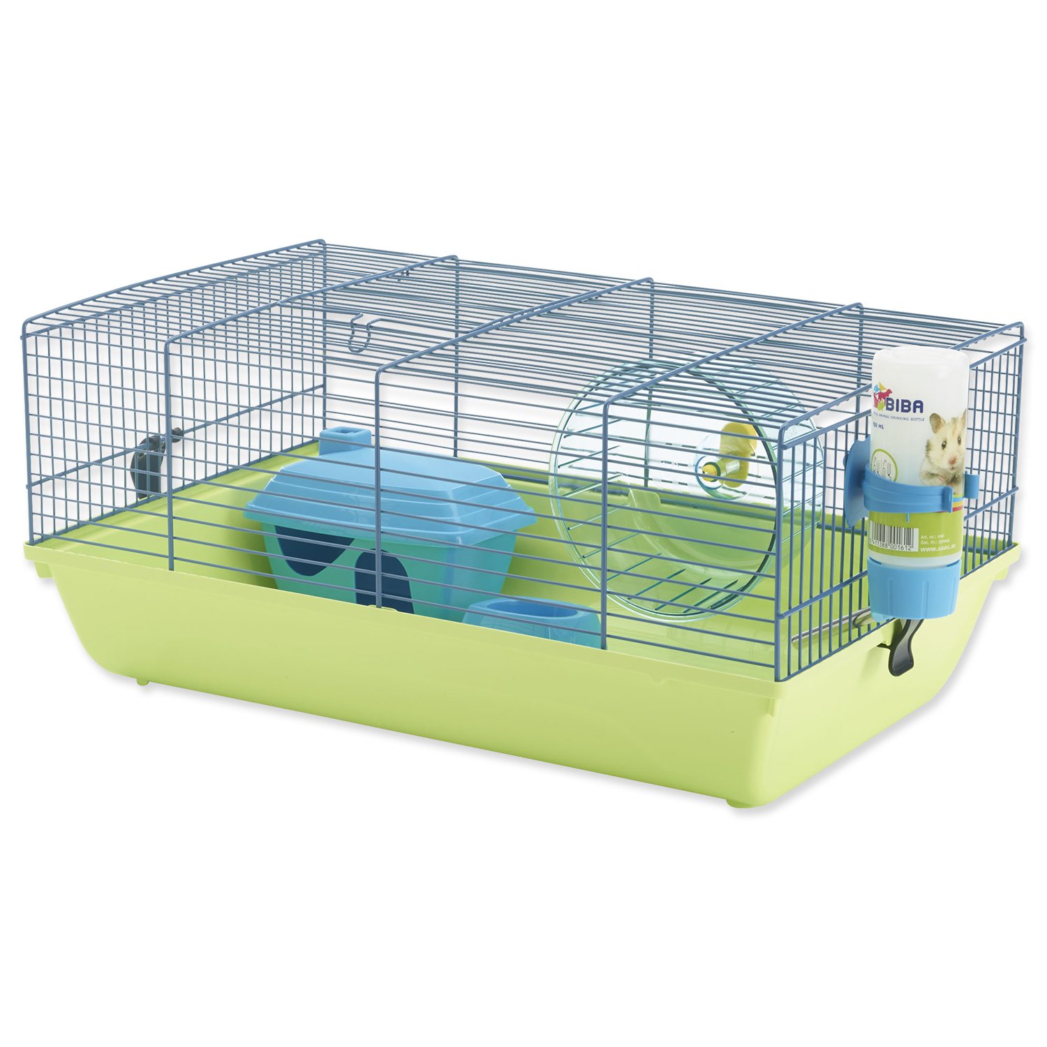 Klec je vybavená plastovým domečkem, miskou na krmení, kolotočem a napaječkou.Rozměry
