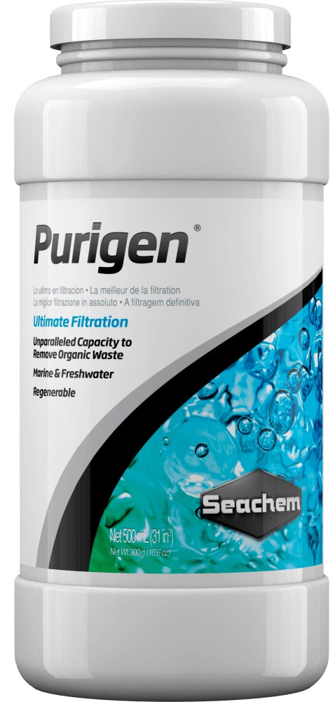 Purigen® odstraňuje rozpustné i nerozpustné organické nečistoty – rychle, účinně a bezpečně. Navíc snižuje hladiny amoniaku, dusitanů a dusičnanů tím, že eliminuje jejich dusíkatý původ. Během použití tmavne a jakmile ztmavne na tmavě hnědou/černou barvu, lze jej snadno regenerovat běžným bělidlem. Vhodný je pro sladkovodní i mořské akvárium, kde nahrazuje kombinaci aktivního uhlí, pryskyřic i jemných filtrů.
