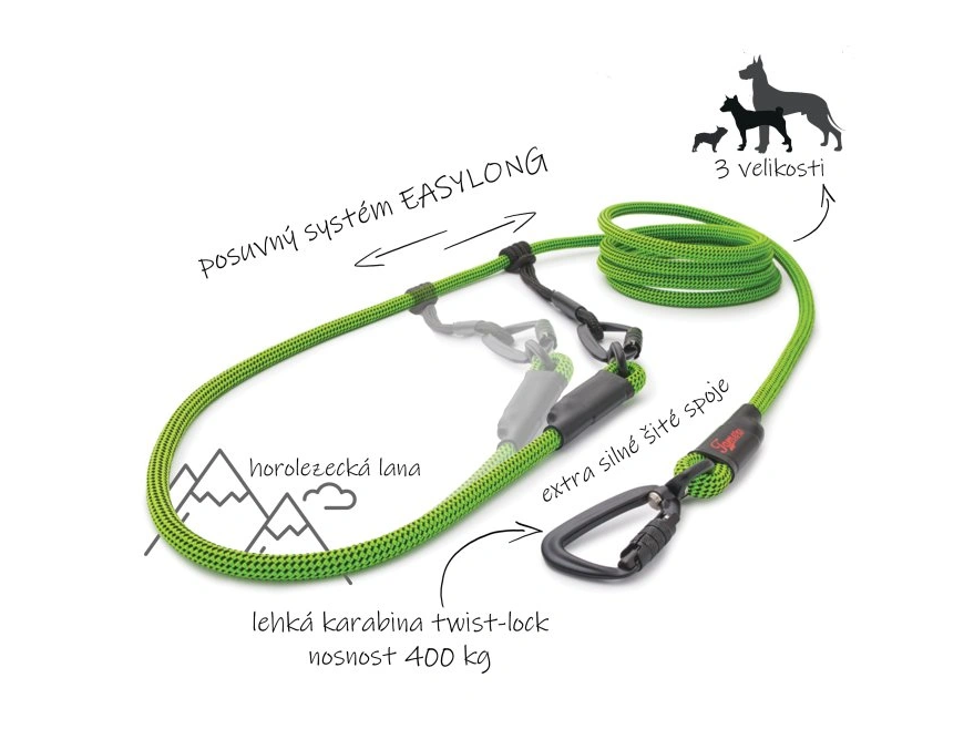 Kvalitní, ručně vyráběné vodítko s originálním posuvným systémem umožní zkracování a prodlužování vodítka v celé délce snadným pohybem několika prsty. Naše TOP lanové vodítko je nově osazeno karabinami TWISTLOCK na obou koncích. Uvedená velikost je ideální pro velké plemeno 8 - 50 kg.Hlavní přednosti