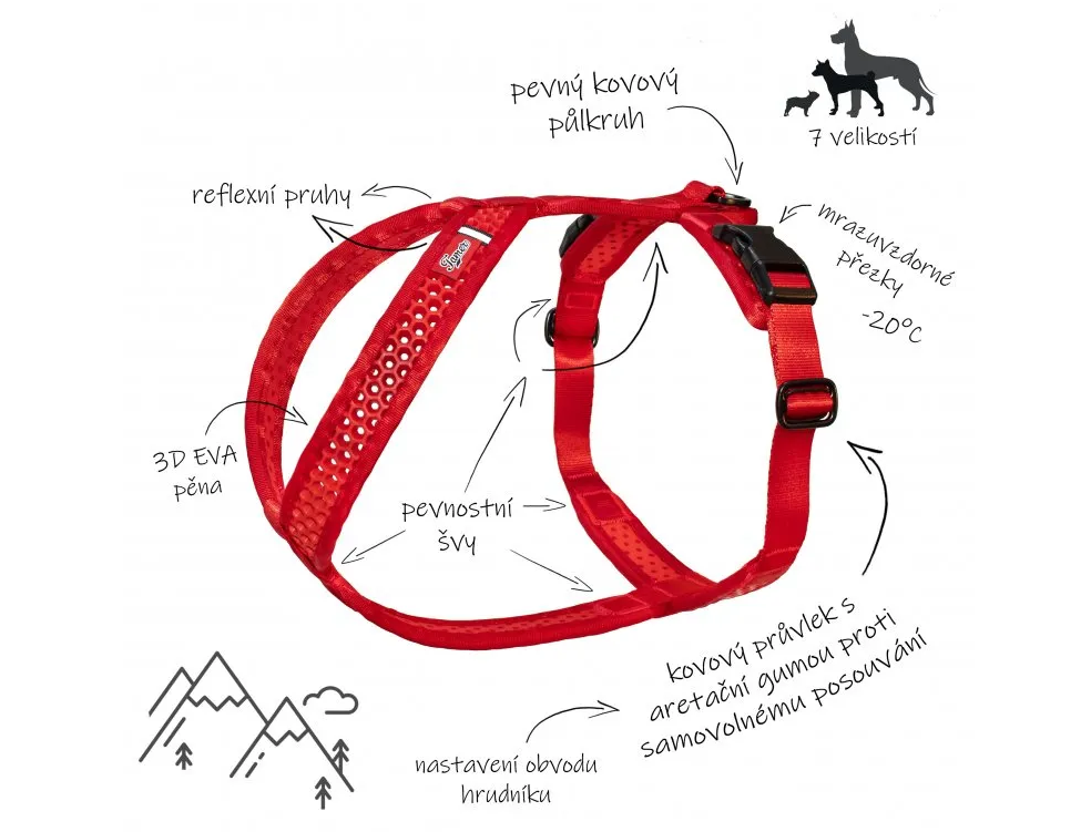 - Tvar (Y) kolem krku poskytuje ideální rozložení tahu a zároveň neomezuje ramena a dech vašeho parťáka