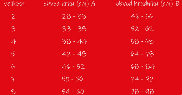 Zde si můžete dle změřených parametrů A (obvod krku) a B (obvod hrudníku) vybrat ideální velikost.